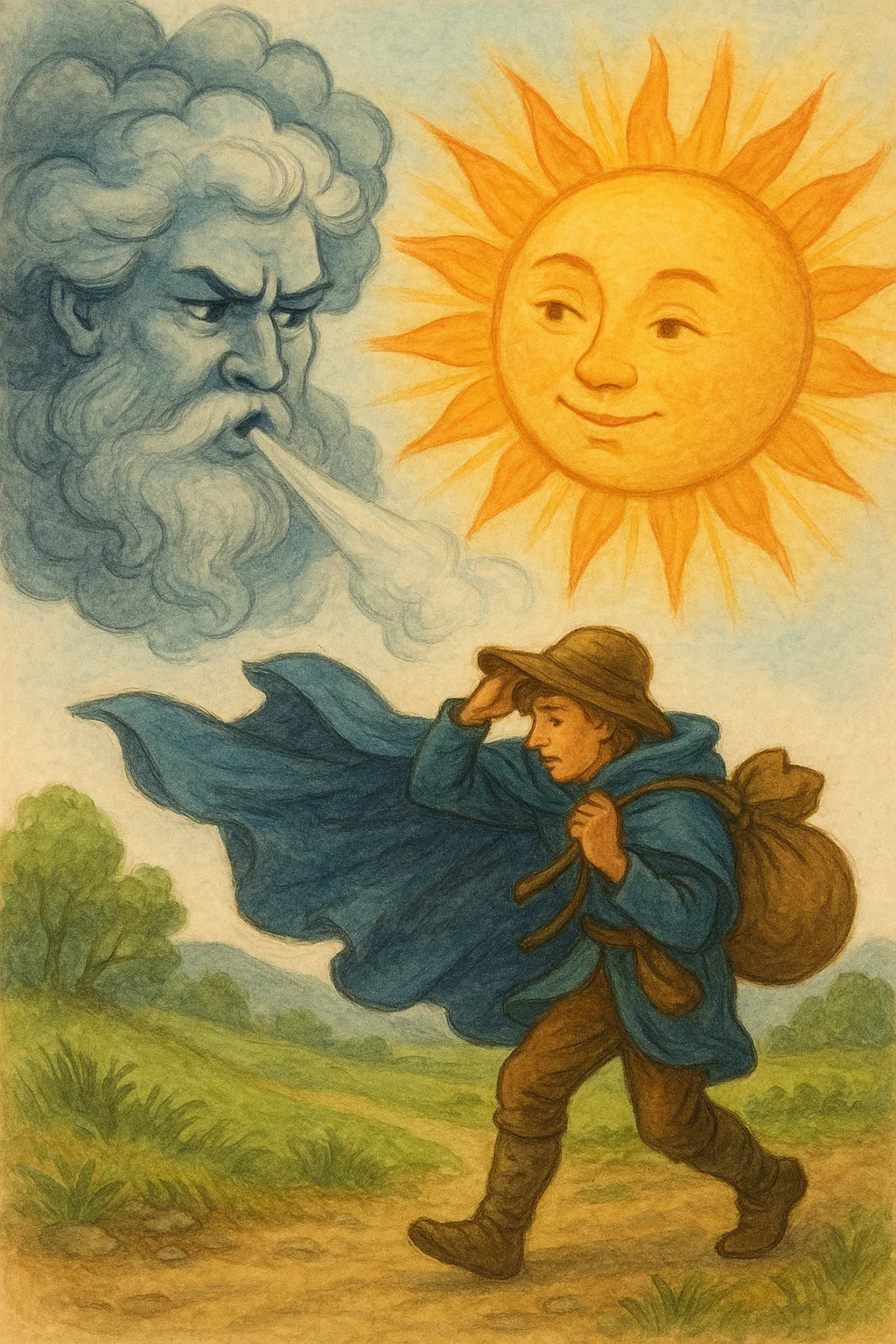イソップ寓話の一つで、北風と太陽が、どちらが強いか競うために、旅人のコートを脱がせた方が勝ち、という力試しで勝負をする。
